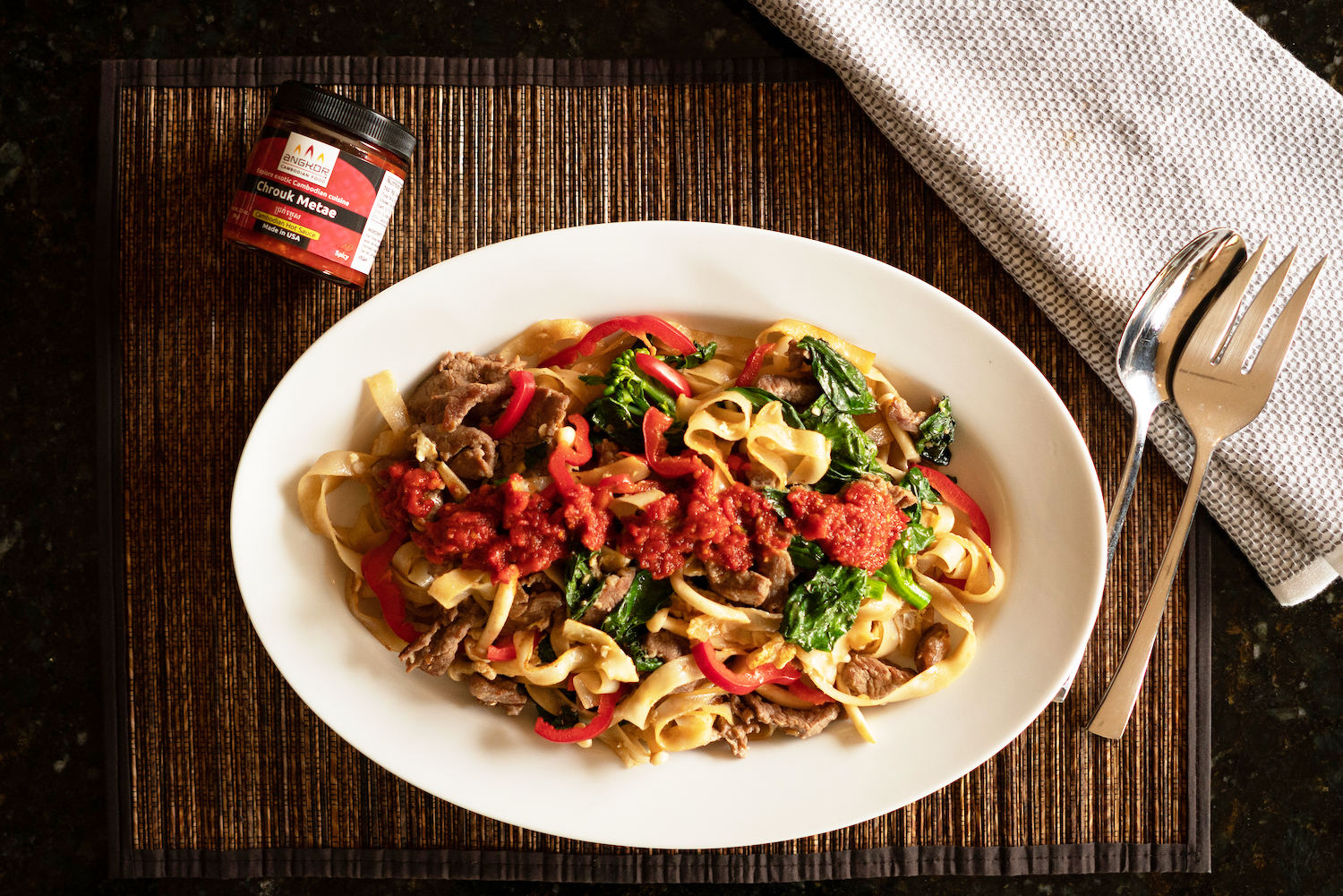 Pan fried rice noodles a perfect way to enjoy with Chrouk Metae (Cambodian Hot Sauce) Cambodian Chow Fun (Cha Me Kataing) Cha Me Kataing - Pan fried rice noodles with Chrouk Metae ******* For the Topping *******3/4 pound flap steak (sliced ¼" thick)3/4 tsp sea salt1/2 tsp...